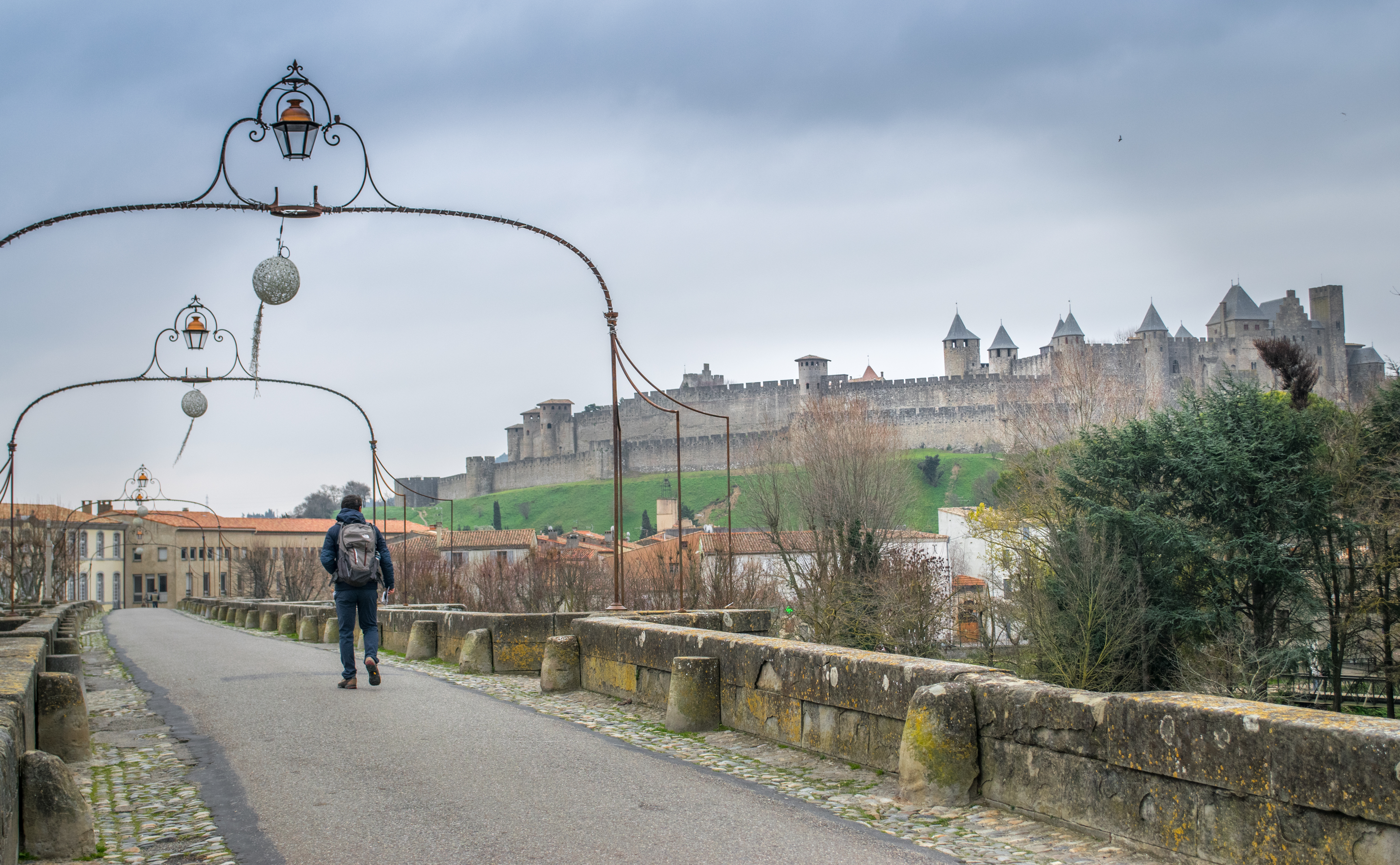 La ciudad vieja reposa sobre una colina que parece tallada con el único propósito de sostener la fortaleza que la rodea. Unas murallas sólidas y robustas de origen romano delimitan el primer perímetro mientras que otras, más altas, más esbeltas y más modernas, enclaustran el castillo que dio cobijo a los vizcondes de Trencavel desde el siglo XII. Tras salvar el desnivel que nos separaba de la entrada, nos encontramos frente a la entrada principal de la ciudad. Un puente levadizo sobre un foso que antaño fue una barrera infranqueable contra invasores, pero que ahora reposaba ante nosotros abierto, invitándonos a entrar.