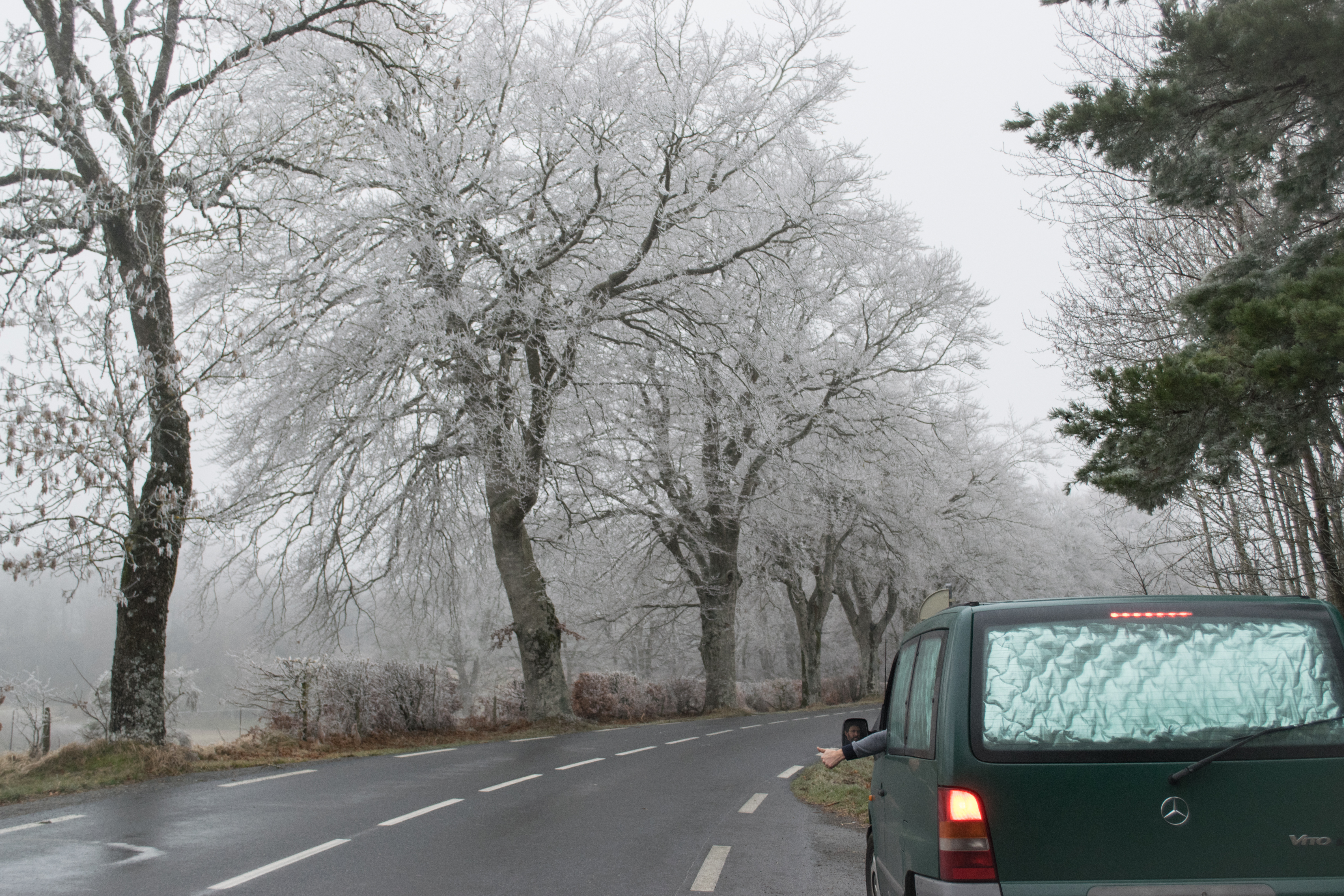 En aquella ocasión, la niebla, e incluso la nieve, decidieron acompañarnos mientras atravesábamos el país de los Albienses. A pesar de que disponemos de neumáticos de invierno y de que tenemos experiencia conduciendo con nieve, decidimos ir muy despacio. Total… ¡no tenemos ninguna prisa!